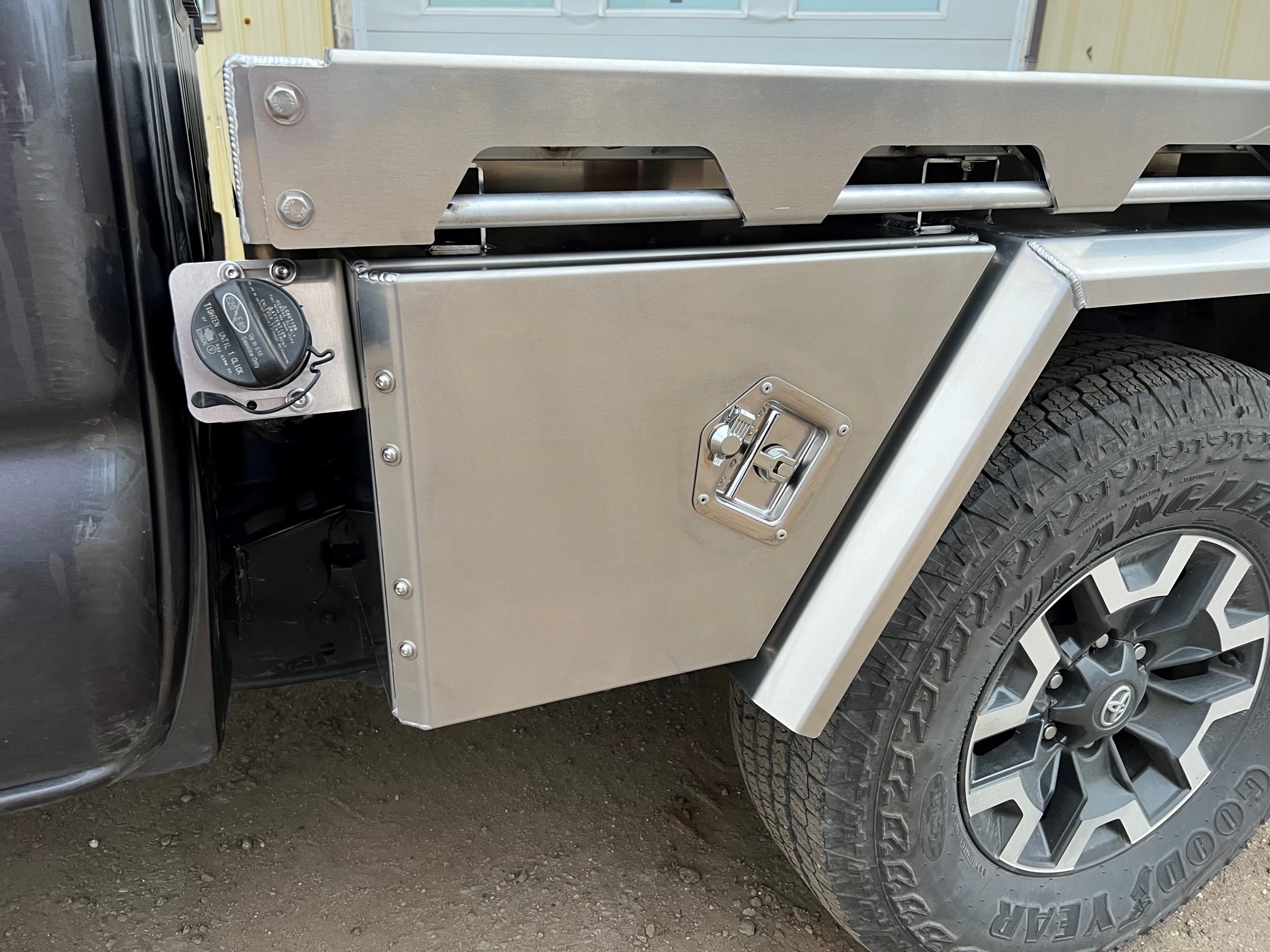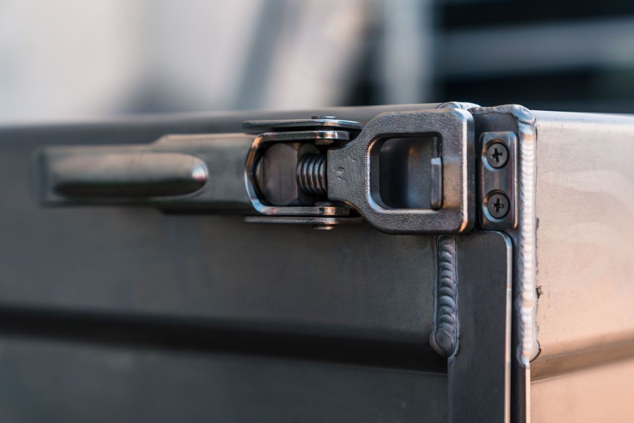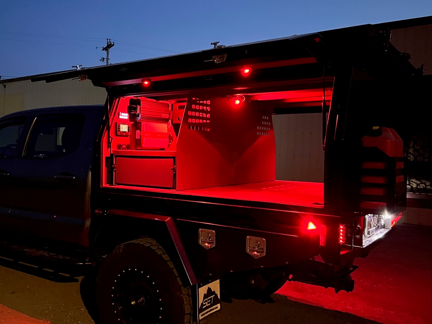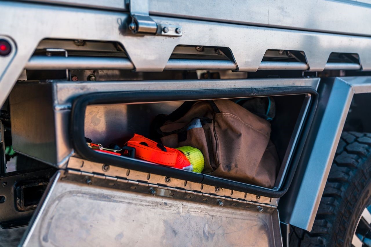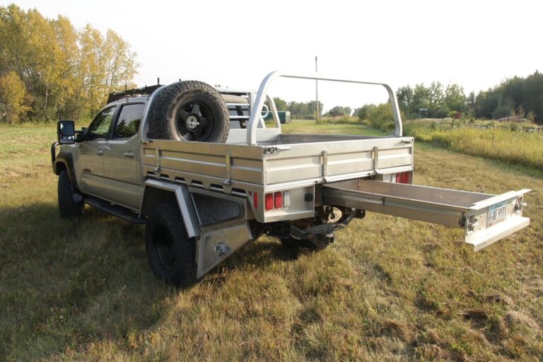Double Cab Long Box 2017 Toyota Tacoma featuring the 84 Series Tray, in the 76″ width. Utilizing front and rear tool boxes, headboard, 35″ clearance fenders and rear pull-out drawer.